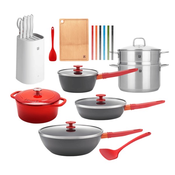 双立人锅具套装包含21件,涵盖了炒锅、煎锅、蒸锅、珐琅锅、菜刀等多种炊具,旨在为家庭提供全面的烹饪解决方案。而特福锅具套装则以其可拆卸手柄和不粘设计,强调多功能与便捷,适合现代快节奏生活的需求。