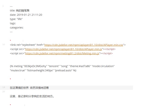 link(rel="stylesheet" type='text/css', href="https://cdn.jsdelivr.net/npm/aplayer@1.10/dist/APlayer.min.css") script(type='text/javascript', src="https://cdn.jsdelivr.net/npm/aplayer@1.10/dist/APlayer.min.js") script(type='text/javascript', src="https://cdn.jsdelivr.net/npm/meting@1.2/dist/Meting.min.js")