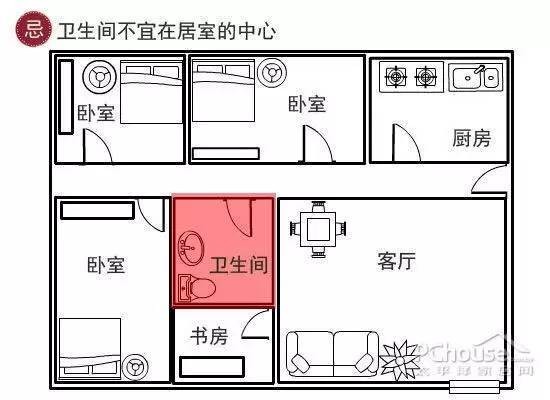 忌:卫生间不宜在居室的中心,秽气极易对流到其他房间,居住其中,天天吸入大量秽气,易得疾病。此外,卫生间在中部,让秽气不能快速散去,影响家人健康。2:摆好卫生间用具 正确摆放好风水
