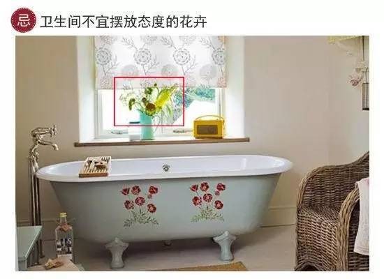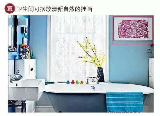 宜:卫生间是污秽处理之地,要适当营造光亮干洁的环境,所以在卫生间可以摆放些简约小画等清新自然的摆设,美化环境心情。