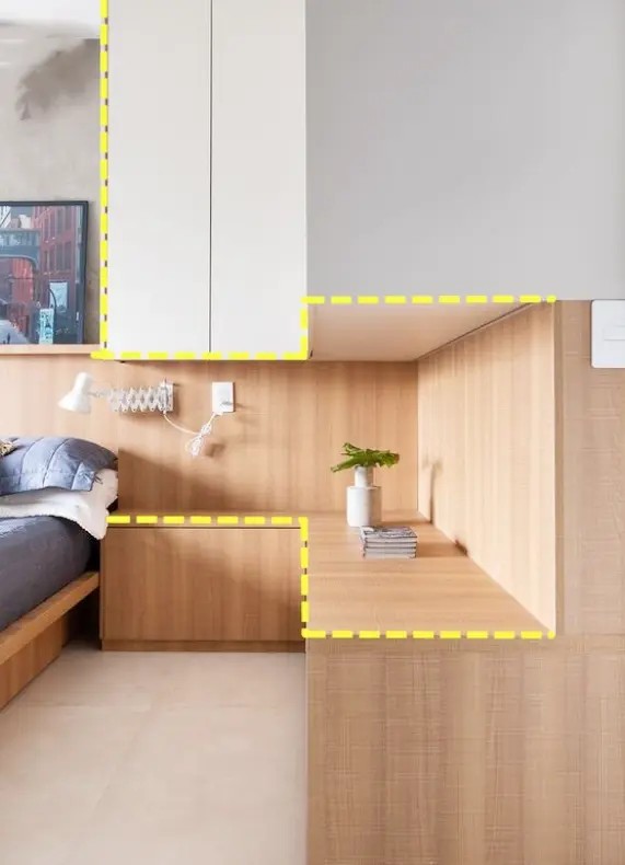 当然,替代方案中,也有一种收纳量较高的方式,围绕床四周打柜子。收纳量得以提升的同时,要注意,相对而言,会比较压抑。