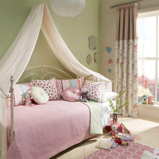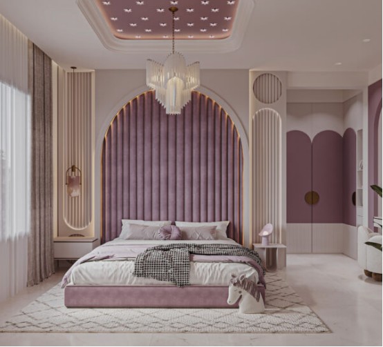 用柔美元素缔造童话魔法。墙面选用薰衣草紫、裸粉或冰蓝色系。床顶悬挂薄纱/蕾丝帷幔,搭配水晶吊灯或串灯。