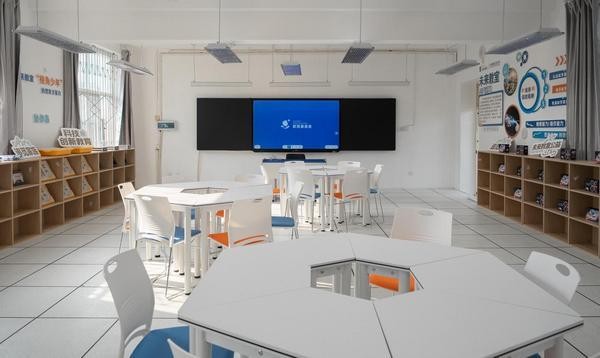 此次落成的未来教室,完整呈现了“空间+设备+课程”三位一体标准化方案。教室集前沿智能硬件、多媒体系统与数字资源于一体,内部科学规划了展示墙、协作岛与智造区三大功能模块。