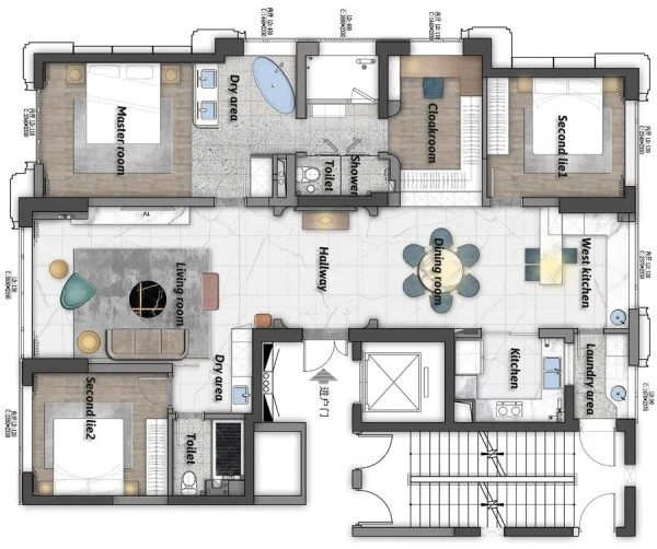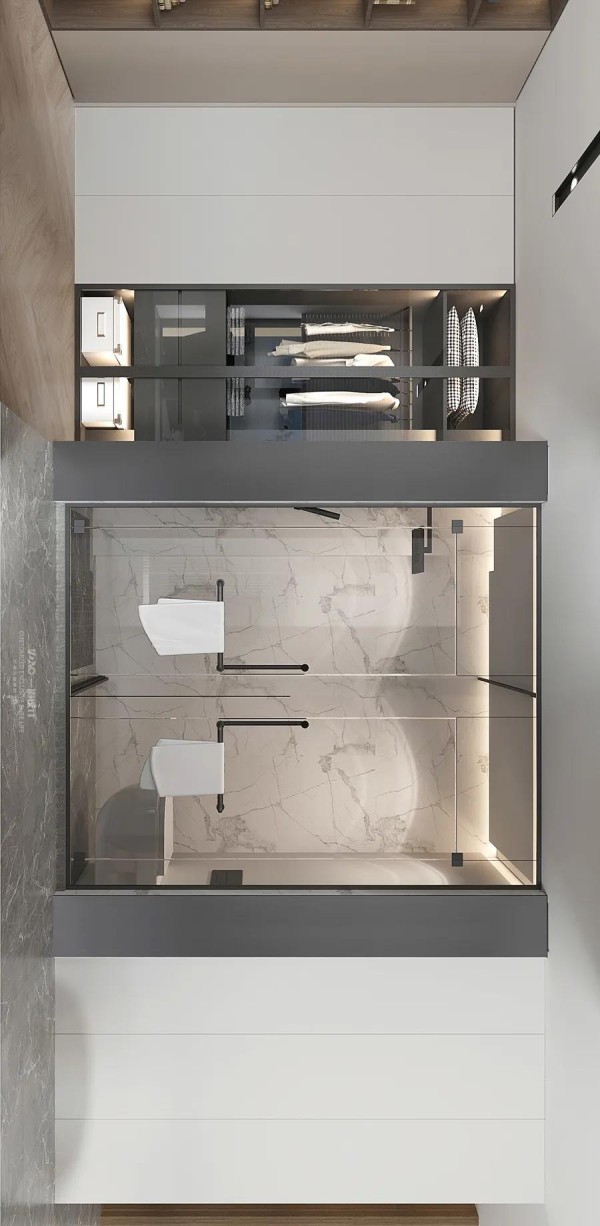 整个空间更加宽敞,衣帽间位于卫生间边上,使用更加便捷,也让卧室与卫生间更加一体化。