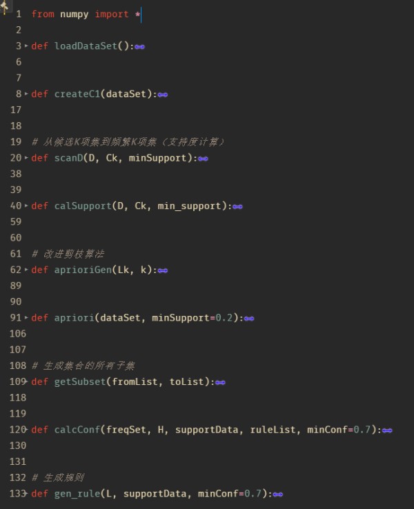 Apriori 算法主要由以下函数实现计算出强关联规则:
