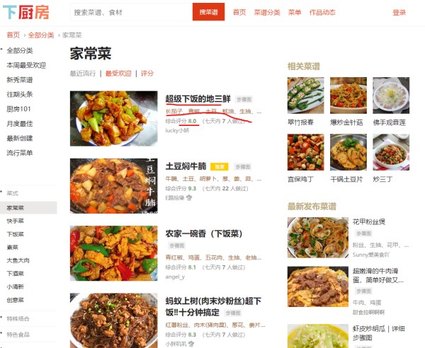 以家常菜为例,爬取每一页每一张菜谱的菜名,食材,评分,种类,并保存为 csv: