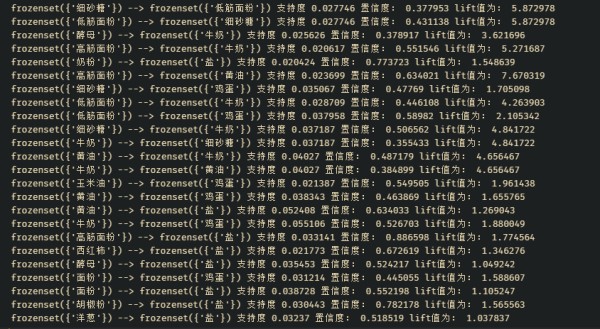 frozenset({'细砂糖', '鸡蛋'}) --> frozenset({'牛奶'}) 支持度 0.021773 置信度:0.620879