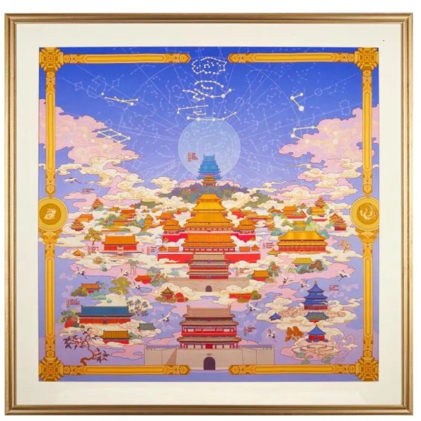紫气东来,群星之下中轴建筑与天宫星辰一一对应。边框的玉兔与金乌则分别象征日月,也象征画面正中的中轴线。左阳右阴,承载着中国人阴阳和合,比中而行的价值观。
