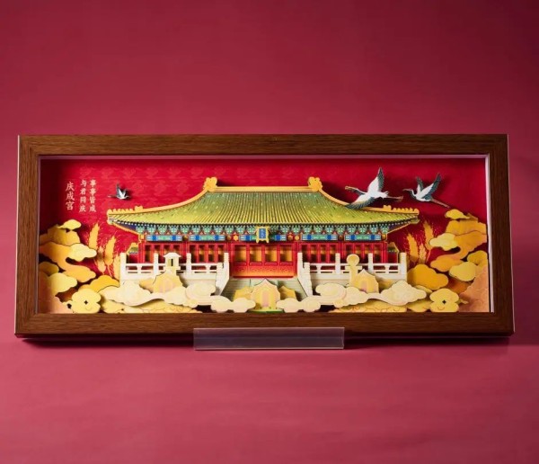 纸雕形象展现了被庆云簇拥的庆成宫,辅以麦穗、寿山、祥云,给人带来丰足喜乐。