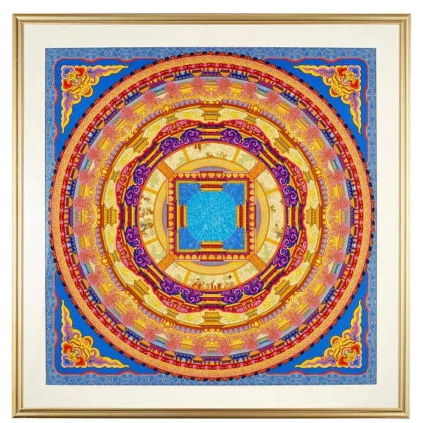 100%桑蚕丝材质的丝巾上展现了天宫藻井外侧共四层的天宫式建筑。它融合了中国古代关于天宫的神话,有着逐级上升、层层高登的含义。