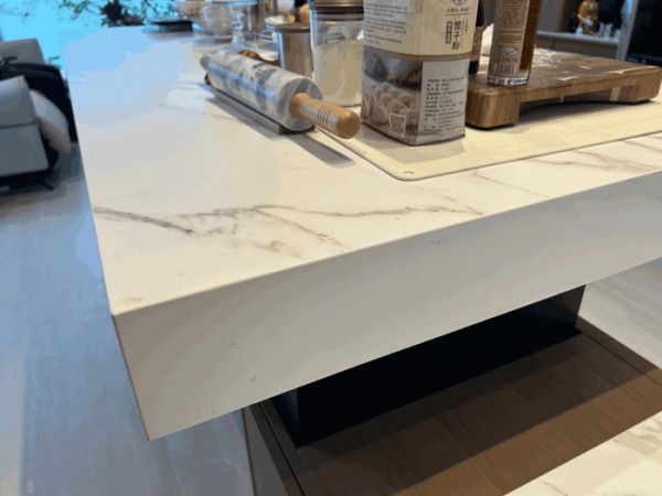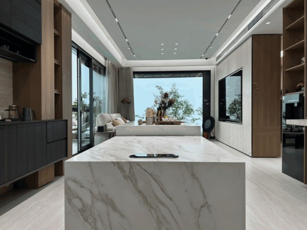 德赛斯岩板卡拉卡塔同样运用于中海样板间开放式厨房的台面,以其卓越的耐磨、耐刮、耐高温和零吸水零渗透的物理性能,完美解决了传统厨房台面的使用痛点。无论是直接的刀具切割还是高温锅具的放置,都无法对其表面造成损伤。同时,无缝一体的加工工艺,让整个台面与岛台显得简约而高级,极大提升了空间的整体感与清洁便利性。