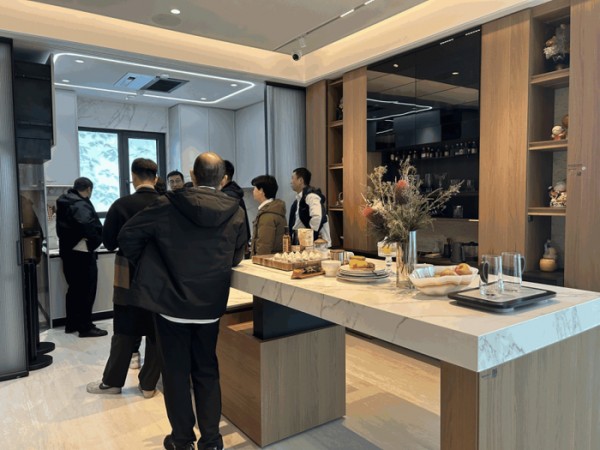 在中海地产的样板间内,中海好房子展示的德赛斯岩板可变岛台成为空间视觉的焦点,吸引了众多参展者的目光。岛台台面可升降、功能模块可变,无论是备餐还是聚餐、品茶等,各种场景都能轻松驾驭。