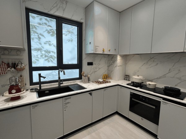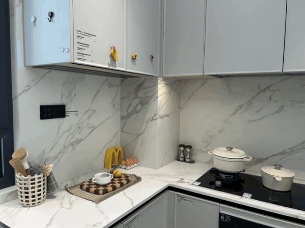卡拉卡塔灵感源于闻名世界的意大利卡拉卡塔大理石,其纯净的白色基底上,流淌着或粗或细的灰色、金色脉络,宛如一幅天然的水墨画卷,为厨房空间赋予了开阔、明亮且极具艺术感的气质。卡拉卡塔在安装时还有镜面纹理拼接、连纹拼接的效果,这种创新给建筑师和设计师提供了更多灵感和震撼效果。
