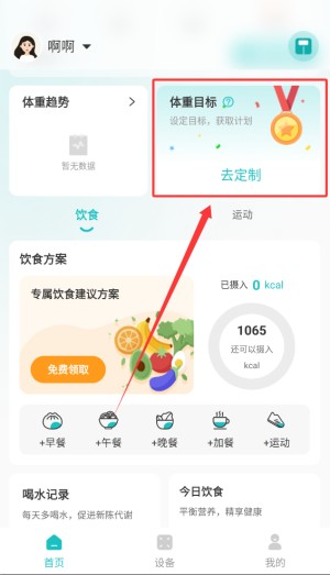 3、通过首页功能可设定理想体重目标,系统将据此生成个性化健康管理方案。