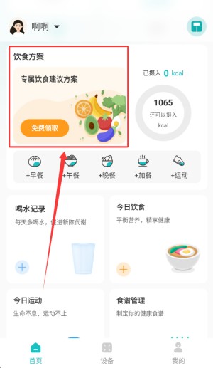 4、主页面提供专业饮食计划领取服务,根据用户需求推荐科学营养配餐方案。