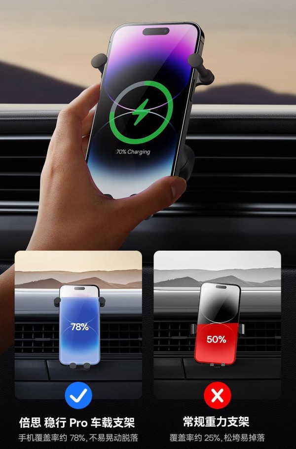 有多稳?在 Y 字结构打开夹持下,倍思稳行 Pro 对手机的覆盖率约为 78%,而大部分的普通重力支架仅有 25%,从数据上即可看出在物理稳定性上有着鲜明的对比。