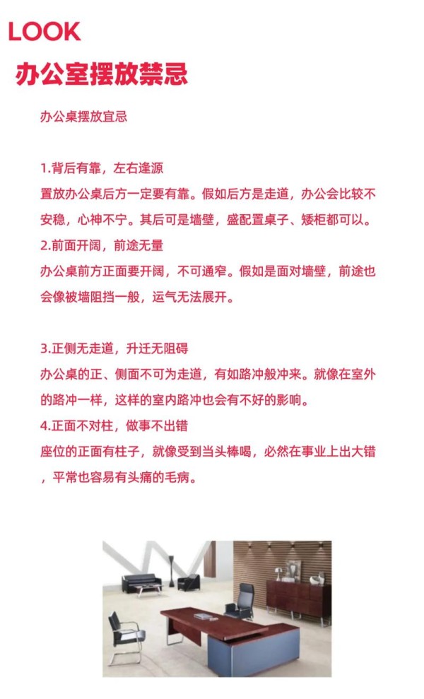 在职场中,办公桌的摆放不仅关系到个人的工作效率,还可能影响到个人的运势。办公桌的摆放位置和布局对人的运势有着重要的影响。以下是一些办公桌风水摆放的忌讳,供大家参考。