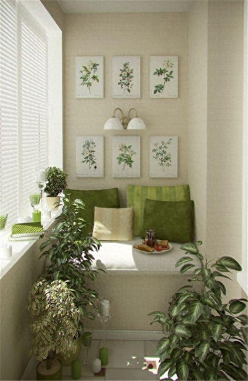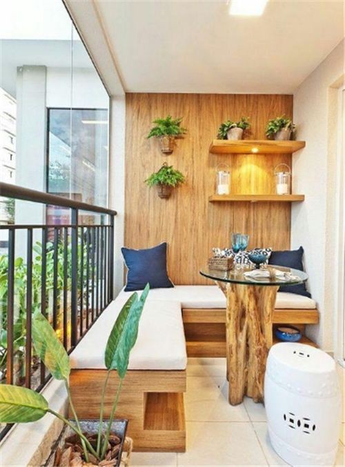 还有一种方法就是在阳台的墙边处打收纳柜,上面铺上坐垫,一举两得,既能够收纳东西,又可以节省空间。