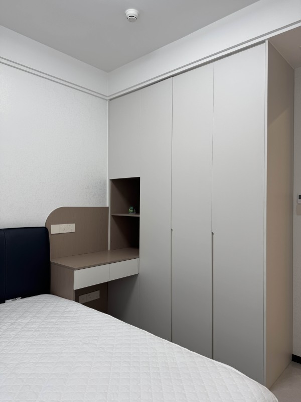 能收纳的东西绝不外露,所以要尽可能规划空间做顶天立地柜,有些地方可以做20公分的薄柜,或者是带帘子的架子,在小户型房间真的很管用。