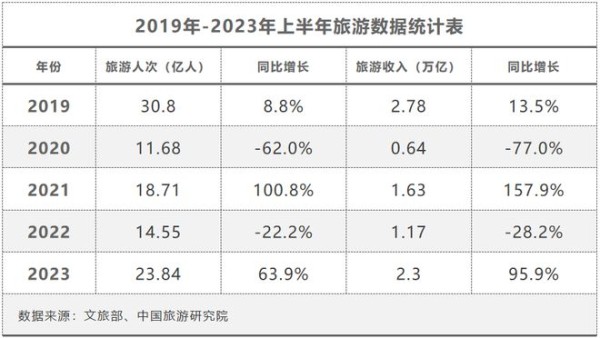 今年以来,我国旅游人次和收入大幅增长,旅游市场呈现强劲提升势头。文化和旅游部公布数据显示,2023年上半年,国内旅游总人次达23.84亿,同比增长63.9%;国内旅游收入达2.30万亿元,比上年增加1.12万亿元,增长95.9%。