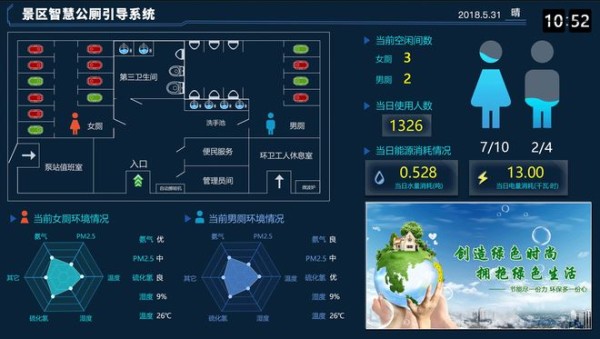 同时,将相关数据同步显示至终端大屏,提供全区域内卫生间厕位实时占用信息,帮助群众快速找到空闲的厕位,疏导人流。
