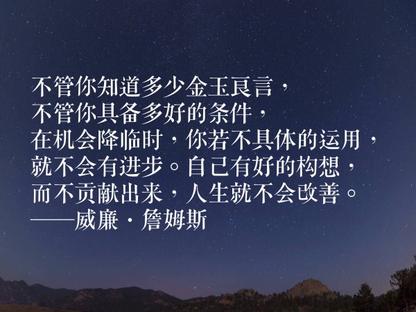 不管你知道多少金玉良言,不管你具备多好的条件,在机会降临时,你若不具体的运用,就不会有进步。自己有好的构想,而不贡献出来,人生就不会改善。——威廉·詹姆斯