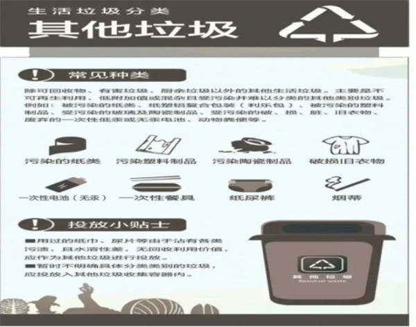 其他其他垃圾是指除可回收物、有害垃圾、厨余垃圾之外的生活垃圾,包括废弃卫生巾、一次性纸尿裤、烟蒂、大骨棒、贝壳等。