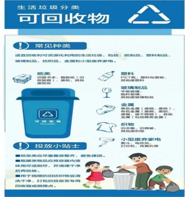 可回收物主要包括废纸、塑料、玻璃、金属和布料五大类。这些垃圾通过综合处理回收利用,可以减少污染,节省资源。