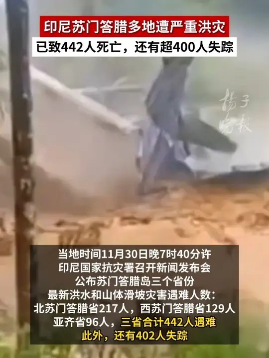印尼苏门答腊多地遭严重洪灾:已致442人死亡,还有超400人失踪