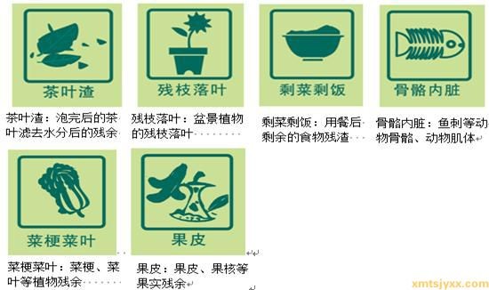 主要包括:废弃的剩菜、剩饭、蛋壳、瓜果皮核、茶渣、鱼刺、骨头、内脏等。
