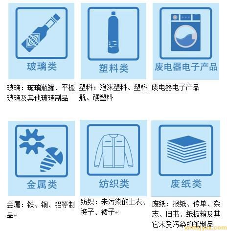 主要包括:纸类(报纸、传单、杂志、旧书籍、纸板箱及其它未受污染的纸制品等)、金属(钢、铁、铜、铝、易拉罐等金属制品)、玻璃(玻璃瓶罐、平板玻璃、啤酒瓶及其他玻璃制品)、除塑料袋外的塑料制品(泡沫塑料、塑料瓶、饮料瓶、硬塑料制品等)、未污染的纺织品、电器、电子产品、纸塑铝复合包装(牛奶盒)等。