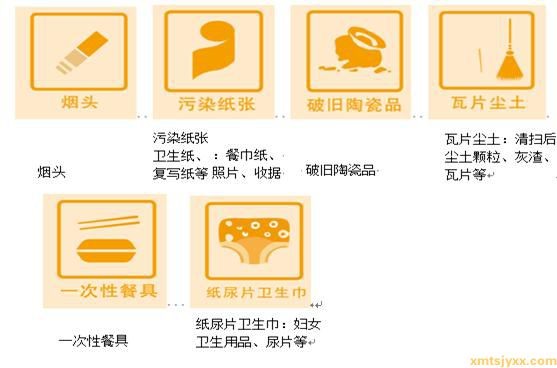 主要包括:受污染与无法再生的纸张(纸杯、照片、复写纸、压敏纸、收据用纸、明信片、相册、卫生纸、纸尿片等)、塑料袋与其他受污染的塑料制品、破旧陶瓷品、妇女卫生用品、一次性餐具、烟头、灰尘等。