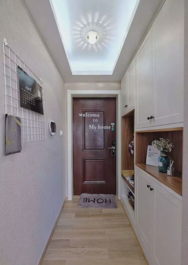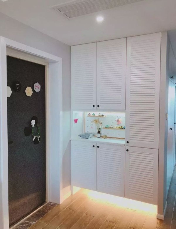 在玄关处装上一个洞洞板,完美的嵌入在鞋柜的中间,加上隔板、挂钩的搭配,再也不担心钥匙等会丢掉了。