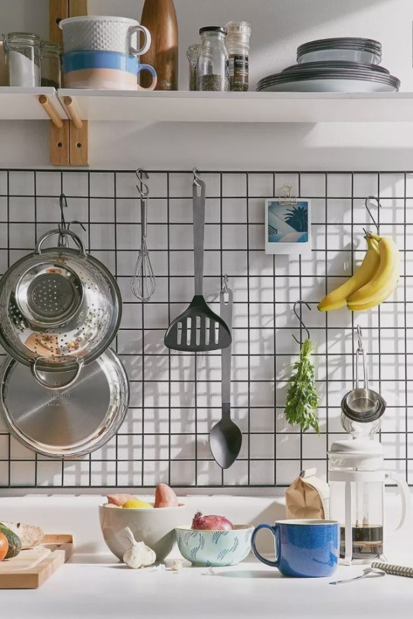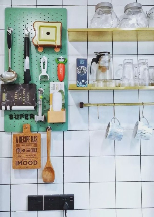 厨房也是一个比较需要收纳设计的地方,各种厨具都可以挂在洞洞板上,利用好橱柜和吊柜中间的空间,拿取非常方便。