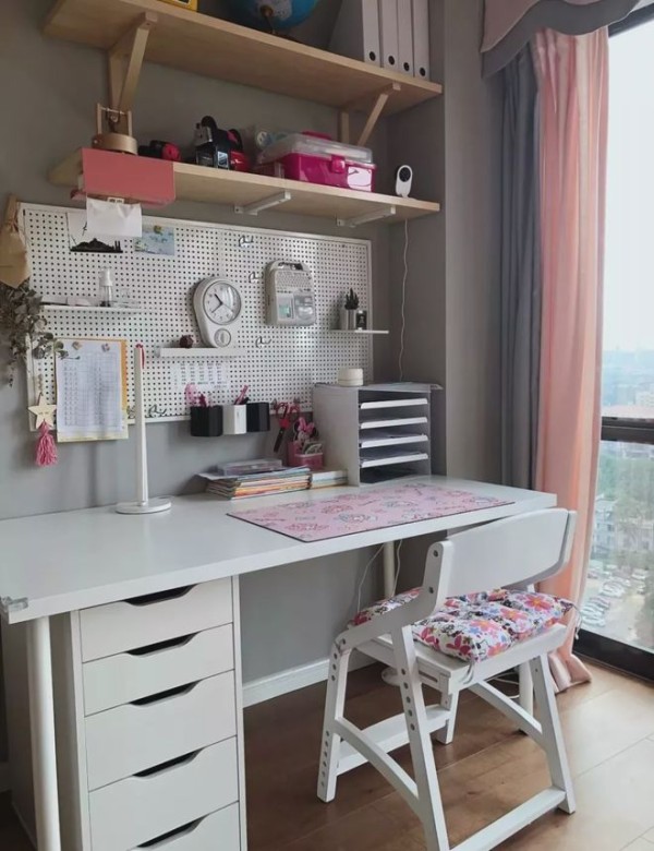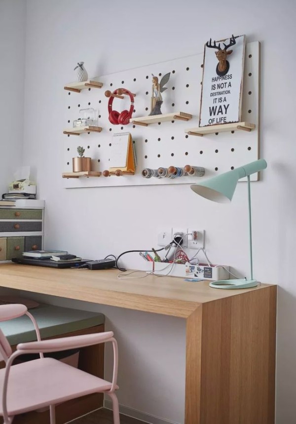 洞洞板比较常见的还是出现在书房、工作区里的,给洞洞板配色隔板,书籍、绿植和装饰品等都可以挂在上面。
