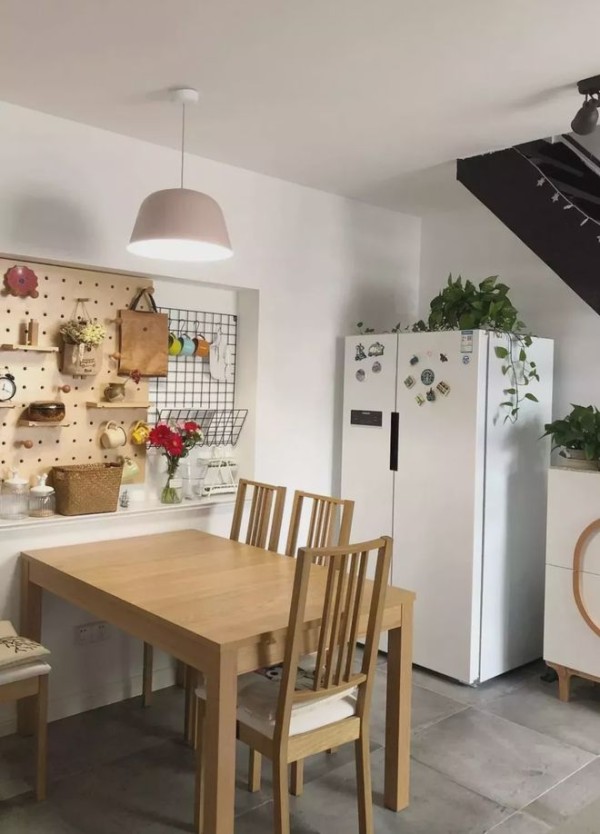 还可以选择把洞洞板和铁丝网给结合起来,利用餐厅边的壁龛空间来做收纳,哪里还需要去设计一个餐边柜,超级省空间。
