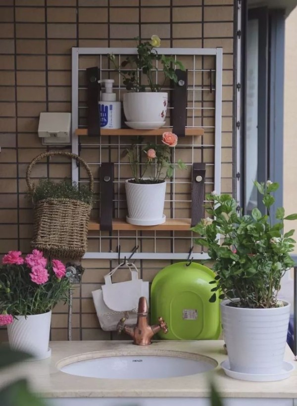 或者是在阳台上做一个铁丝网,把绿植给吊起来一部分,这样也不用担心家里没有地方来种绿植了,放在墙上多好。