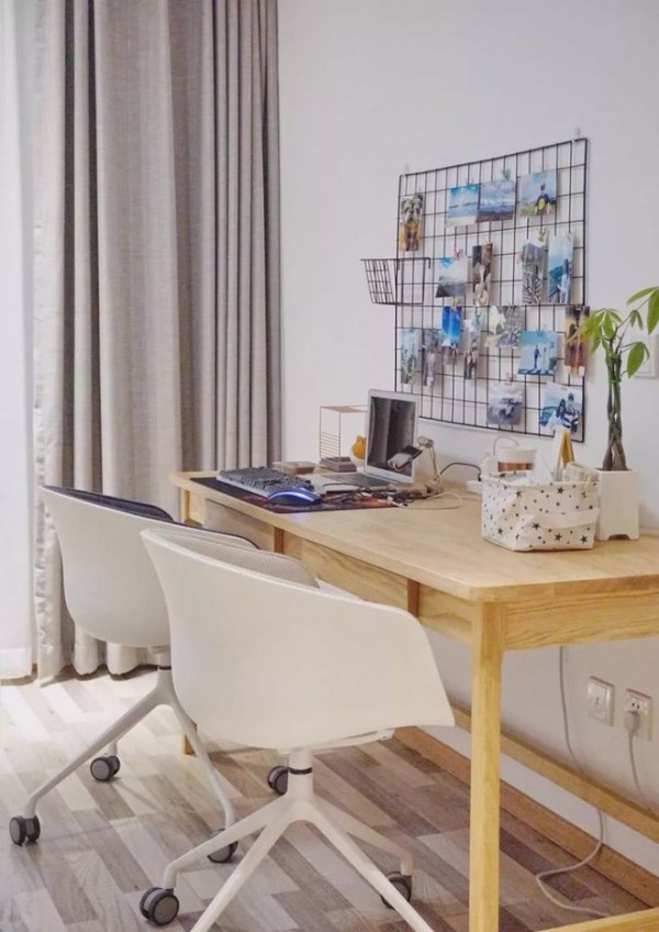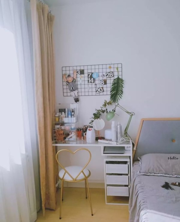 在卧室里也可以利用铁丝网来做装饰,把床头柜替换成书桌,也更适合小户型的设计,还可以代替梳妆台。