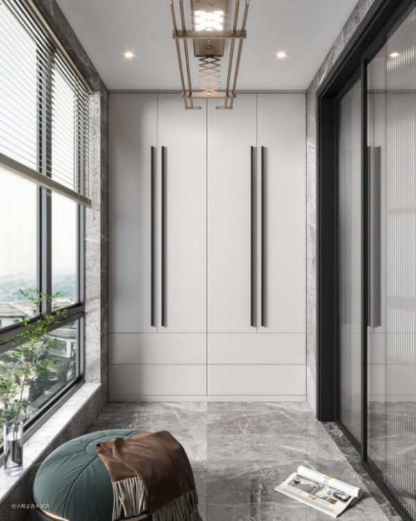 对于小户型,房间内做衣柜若没有位置做,但是对于储物需求又是比较大,可以在阳台内设计为一个衣帽间,有一些主卧阳台是可以设计步入式衣帽间的,就可以利用阳台做到顶的衣柜,过季的衣服或者多余的被子就可以存放在这里,还不占主卧的衣柜空间,还显得整个空间的质感提升满满。