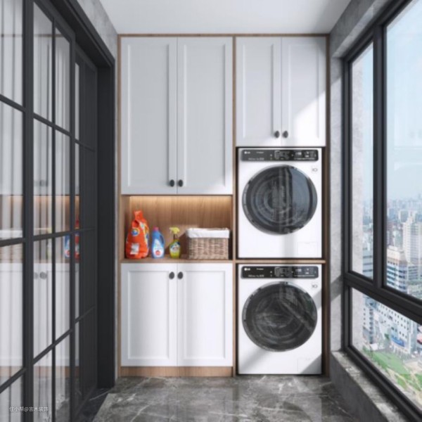 洗衣机加收纳柜的一种组合,洗衣机放浴室怕收潮,放在厨房又比较占地方。通过定制橱柜把阳台的部分空间利用,洗衣房不失为一个不错的选择,这样晾晒衣服的话变得更加方便。阳台与卫生间比较,空间相对来说是比较大的,洗衣,晾衣、烫衣都可以在阳台上完成,除了洗衣外,还可以设计收纳柜等等,不仅为卫生间省出了大量的空间,还带有收纳柜各种杂物,一举两得。如果说阳台足够宽的话,可以加洗衣台、洗手台,可以就在家政区洗,清洗小件物品,再也不用跑卫生间了,增加满满的幸福感。