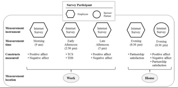 为验证上述假设,本文在从德国企业Hoppenstedt数据库中随机抽取的不同组织中招募了184名参与者及其配偶,其中115对夫妇提供了初始调查信息和至少5天(最多10天)匹配每日调查的完整数据,最终回复率为23%。本文的数据收集特点是对相同的参与者进行重复测量,以评估在短期内表现出大量个体内部差异的变量。这种多重测量设计有助于更为准确地描绘出参与者所经受的压力从日常工作到家庭生活的溢出。参与调查的员工们被要求在两周内的每个工作日完成四项简短的调查,而员工的伴侣需要在这10个工作日的每天晚上完成一次调查。具体的数据收集流程如下: