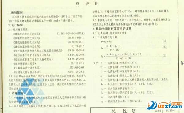 14SS706《玻璃钢化粪池选用与埋设》国家建筑标准设计图集适用于民用建筑和工业建筑生活排水处理用玻璃钢化粪池(罐) 的设计选型及其埋设施工。抗震设防烈度为8度(0.2g、0.3g)及8度以下地区的一般场地土下,单罐有效容积不大于150m3、罐顶埋深0.5m~3.0m且罐底埋深不超过6m。