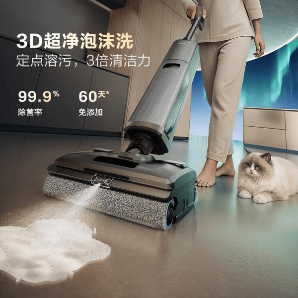这款机器采用了独特的3D超净泡沫清洁技术,能在接触地面瞬间释放细腻泡沫,主动分解油污和粘性残留。相比普通清水拖地,这种定点溶污方式让去污效率提升了约3倍,特别适合厨房、餐厅这类易脏区域。