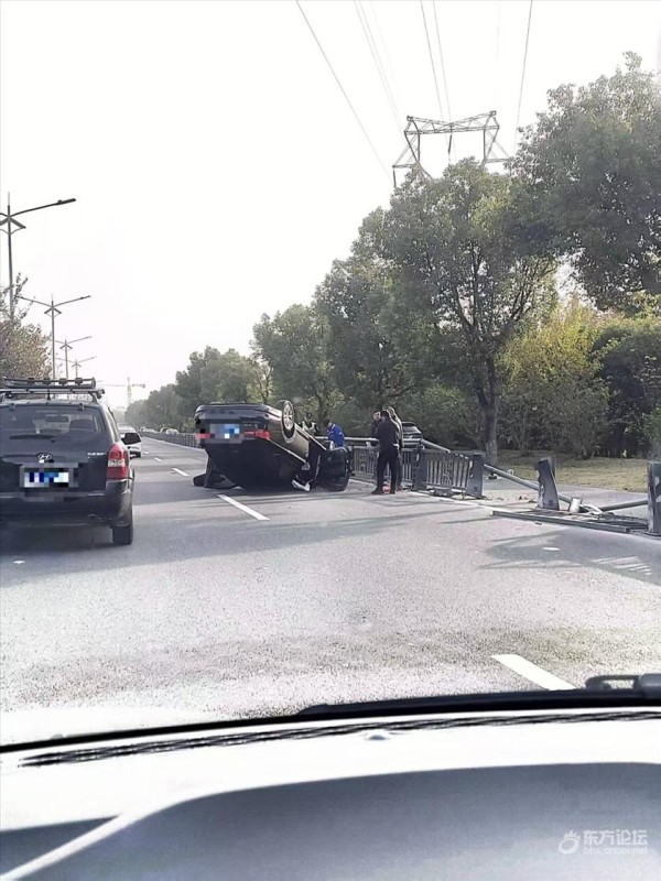 上班遇到堵车,原来是发生了事故,车子四脚朝天了 早上8点左右,奉化往西坞方向,路上堵得一塌糊涂,我还以为怎么了。开过去一看,原来是一辆车撞到护栏后四