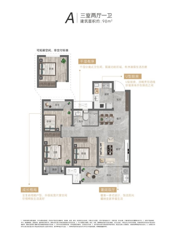 三居室户型面向改善家庭,建筑面积适中,空间布局更加开阔合理,注重居住的舒适度与功能性,是提升生活品质的绝佳选择。户型采用科学的动静分区设计,将客厅、餐厅、厨房等公共活动区域与卧室、书房等私密休息区域严格分离,既保证了公共区域的活动不受干扰,又保障了私密区域的安静与舒适,让家人在享受欢聚时光的同时,也能拥有专属的私密空间。客厅开间阔绰,搭配南向全景阳台,采光通风极佳,视野开阔,能够俯瞰社区园林景观,是家庭聚会、休闲娱乐的核心场所;餐厅与客厅相连,形成一体化的开放空间,同时与厨房形成便捷的动线,聚餐时上菜方便快捷,也让空间感更加通透。主卧采用豪华套房设计,配备独立卫生间、衣帽间与观景飘窗,为业主提供了私密、舒适、尊贵的居住体验;独立卫生间采用干湿分离设计,使用便捷,提升了居住的舒适度与私密性;衣帽间设计满足了业主的衣物收纳需求,让衣物、鞋帽、配饰等摆放更加整洁有序。两个次卧空间宽敞,采光良好,可根据家庭需求分别布置成儿童房与长辈房,儿童房临近主卧,方便父母照顾孩子的起居;长辈房远离公共活动区域,安静舒适,适合长辈休息,同时采光充足,有利于长辈的身心健康。书房空间静谧,采光充足,是办公学习、修身养性的理想场所,也可根据需求改造成客房,满足亲友来访的居住需求,灵活性极强。厨房采用 U 型布局,操作空间宽敞,储物空间充足,能够容纳多人同时操作,提升了烹饪的趣味性与效率;公共卫生间干湿分离,配备优质卫浴洁具,满足家庭日常使用需求,避免早晚高峰拥堵。