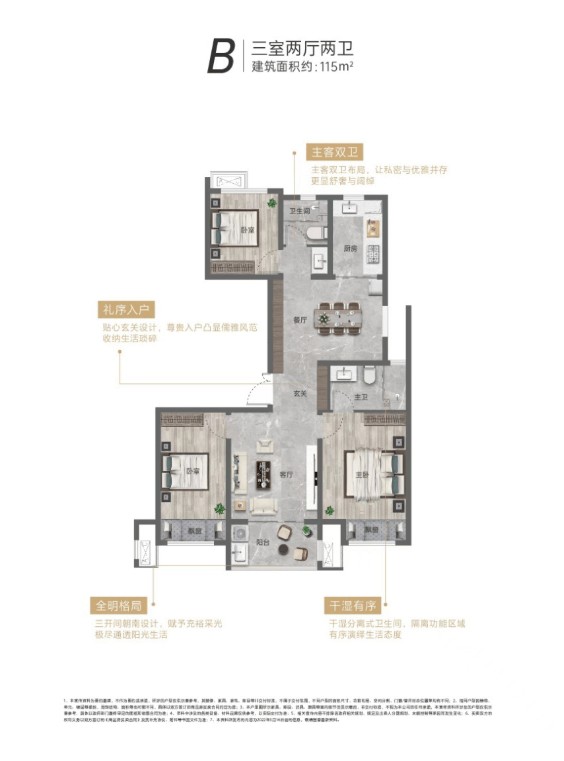 绿色健康户型是项目的另一大核心亮点,从设计源头保障居住健康。户型采用南北通透、全明设计,最大化利用自然采光与通风,减少细菌滋生与能源消耗;环保建材的全面使用,从源头降低甲醛、苯等有害物质释放,保障室内空气质量;健康细节设计贯穿全屋,如防滑地面、防水防霉墙面、独立通风系统、充足储物空间等,全方位提升居住健康度;户型布局科学合理,动静分区、干湿分离,避免空间浪费与健康隐患,让居住既舒适又安心。
