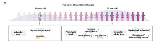 2022年发表在《Med》上的一项队列研究与前者的研究成果相仿,则揭示了中国女性受试者在30岁和50岁左右会出现衰老加剧的特征。