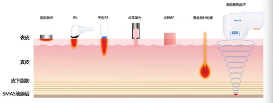 超声炮是一种聚焦超声波,通过聚焦点产生足够的热量,在人体组织(筋膜层、浅脂肪层、真皮层)产生凝固点后进行针对性的治疗。