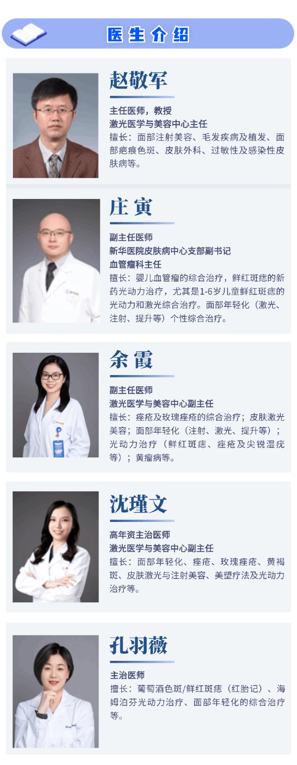 上海交通大学医学院附属新华医院皮肤疾病诊治中心是国家临床重点专科、上海市“重中之重”临床重点学科,是我国最早开展激光美容治疗的单位之一,也是我国毛发移植的开创单位。激光医学与美容中心几十年来不断创新发展,率先引进国际先进的激光设备和技术,已经发展成为集激光美容、注射微整、头皮毛发养护及FUE植发、面部抗衰提升、皮肤外科与医美一体化诊疗,医教研全面发展的大型综合医学美容中心。