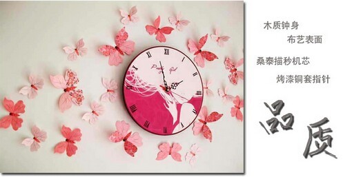 木质钟身加布艺表面,钟面与蝴蝶相互呼应,暖色系的色彩更能添加一种喜悦与温暖。